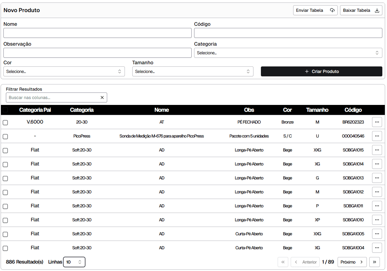 - Os seletores de Categoria, Cor e Tamanho no bloco “Novo Produto” servem apenas para criação de produtos, não para filtrar a lista. Use a busca livre para localizar itens na tabela.
